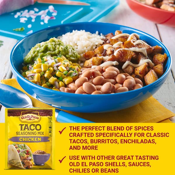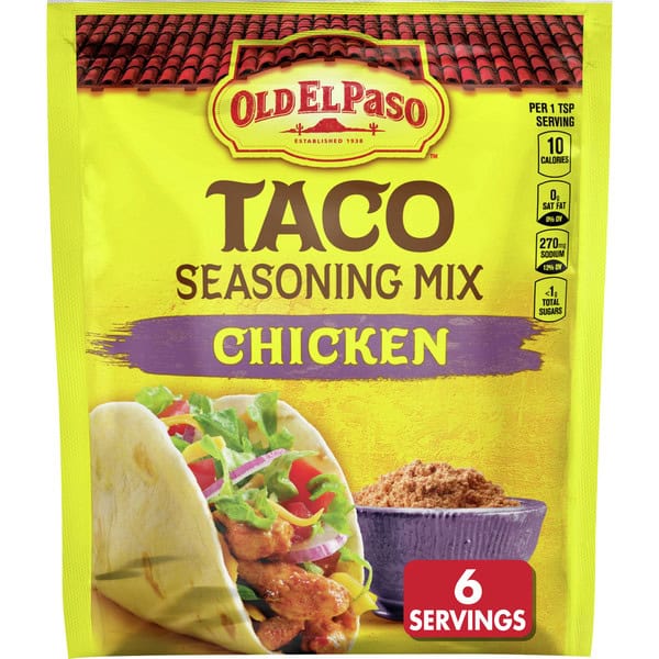 Have a fiesta anytime with Old El Paso Chicken Taco Seasoning Mix. This mixture of zesty spices will add some flare to your next chicken dish. Cook sliced chicken breast in oil until no longer pink. Then, sprinkle the Mexican-style seasoning packet over the meat, add water and simmer for three to four minutes. Use the deliciously seasoned chicken in a variety of Mexican food dishes.