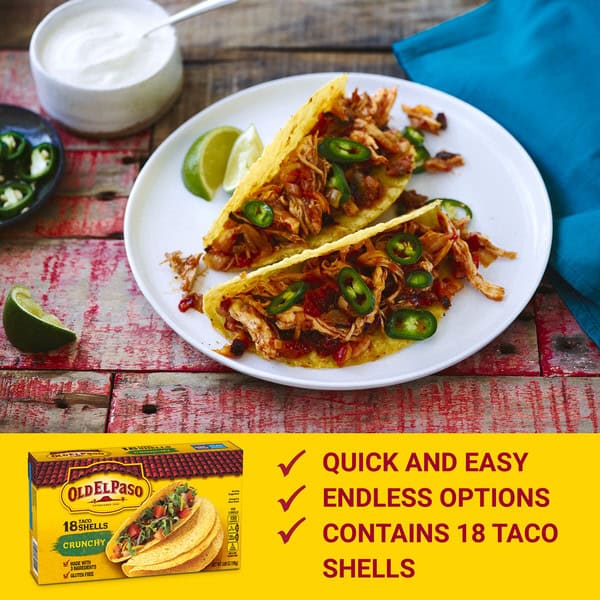 Feed the taco frenzy with an 18-count package of Old El Paso Crunchy Taco Shells. Made with only three ingredients, these gluten-free hard taco shells add a satisfying crunch to taco night. Simply add your favorite meats, cheeses, beans and fresh toppings for tasty tacos that are easily customized to make the whole family happy. Tonight, we taco!