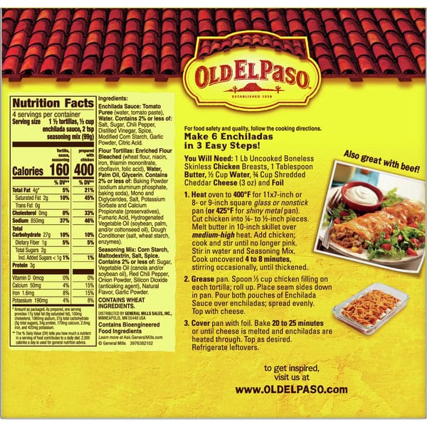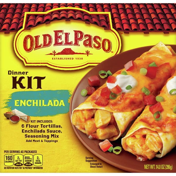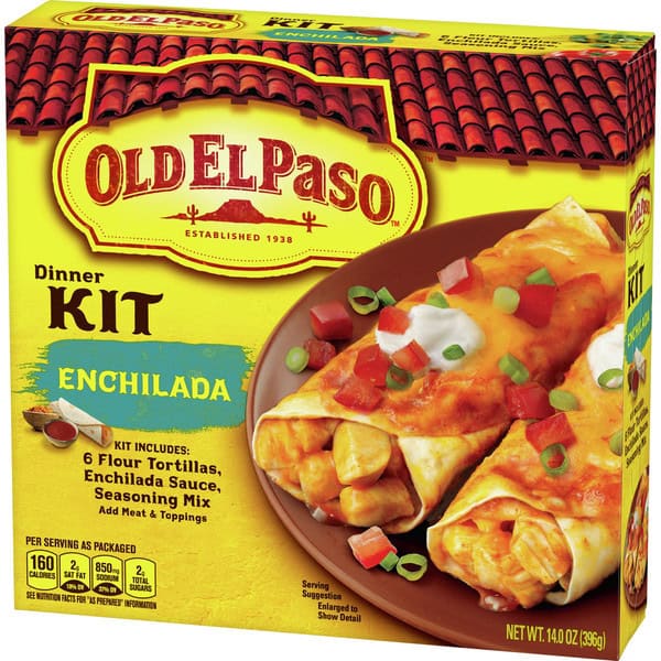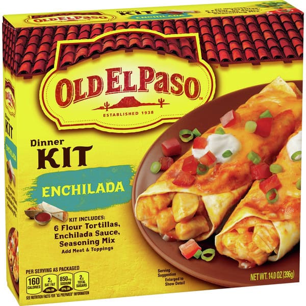 Grab an Old El Paso Enchilada Dinner Kit for a quick and easy enchilada dinner that the whole family can enjoy. Each dinner kit comes with six flour tortillas, seasoning mix and red enchilada sauce. Simply choose your protein of choice and your favorite enchilada add-ins and get started making an easy weeknight dinner. This dinner kit is great for both beef or chicken enchiladas.