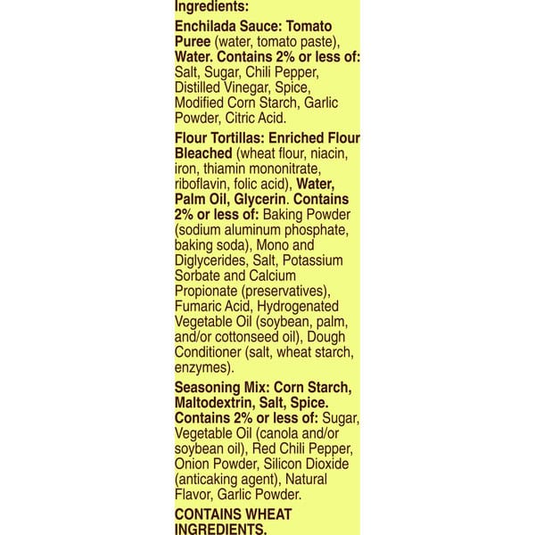 Enchilada Sauce: Tomato Puree (water, Tomato Paste), Water. Contains 2% Or Less Of: Salt, Sugar, Chili Pepper, Distilled Vinegar, Spice, Modified Corn Starch, Garlic Powder, Citric Acid. Flour Tortillas: Enriched Flour Bleached (wheat Flour, Niacin, Iron, Thiamin Mononitrate, Riboflavin, Folic Acid), Water, Palm Oil, Glycerin. Contains 2% Or Less Of: Baking Powder (sodium Aluminum Phosphate, Baking Soda), Mono And Diglycerides, Salt, Potassium Sorbate And Calcium Propionate (preservatives), Fumaric Acid, Hydrogenated Vegetable Oil (soybean, Palm, And/or Cottonseed Oil), Dough Conditioner (salt, Wheat Starch, Enzymes). Seasoning Mix: Corn Starch, Maltodextrin, Salt, Spice. Contains 2% Or Less Of: Sugar, Vegetable Oil (canola And/or Soybean Oil), Red Chili Pepper, Onion Powder, Silicon Dioxide (anticaking Agent), Natural Flavor, Garlic Powder.