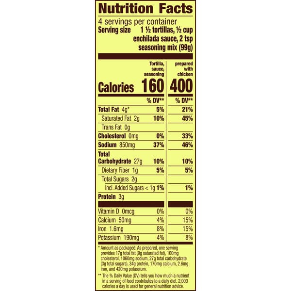 For food safety and quality, follow the cooking directions. Make 6 Enchiladas in 3 easy steps! You Will Need: 1 lb Uncooked Boneless Skinless Chicken Breasts, 1 Tablespoon Butter, 1/2 Cup Water, 3/4 Cup Shredded Cheddar Cheese (3 oz) and Foil. 1. Heat oven to 400 degrees F for 11×7-inch or 8- or 9- inch square glass or nonstick pan (or 425 degrees F for shiny metal pan). Cut chicken into 1/4- to 1/2-inch pieces. Melt butter in 10-inch skillet over medium-high heat. Add chicken; cook and stir until no longer pink. Stir in water and seasoning mix. Cook uncovered 4 to 8 minutes, stirring occasionally, until thickened. 2. Grease pan. Spoon 1/3 cup chicken filling on each tortilla; roll up. Place seam sides down in pan. Pour both pouches of Enchilada Sauce over enchiladas; spread evenly. Top with cheese. 3. Cover pan with foil. Bake 20 to 25 minutes or until cheese is melted and enchiladas are heated through. Top as desired. Refrigerate leftovers.