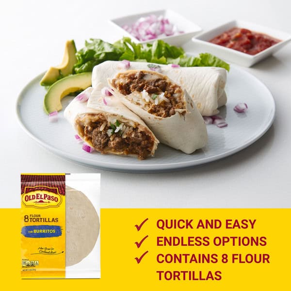When you need a delicious foundation for burritos, fajitas and more, choose Old El Paso Soft Flour Tortillas. These soft flour tortillas help get dinner on the table quickly. Get creative and wrap up your toppings in soft tortillas for the perfect burrito. When you have a package of these soft flour tortillas on hand, you’re always ready for a fiesta.