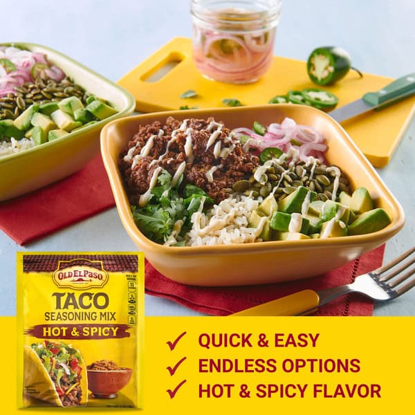 Add some zesty spice to your Mexican food recipes! When you stock your pantry with Old El Paso Hot & Spicy Taco Seasoning Mix packets, you’re ready to celebrate taco night, every night, with a little added spice. These great-tasting taco spices and seasonings help you get tacos on the table. Plus, you can use this seasoning to add bold flavor to meats, soups, dips and more.