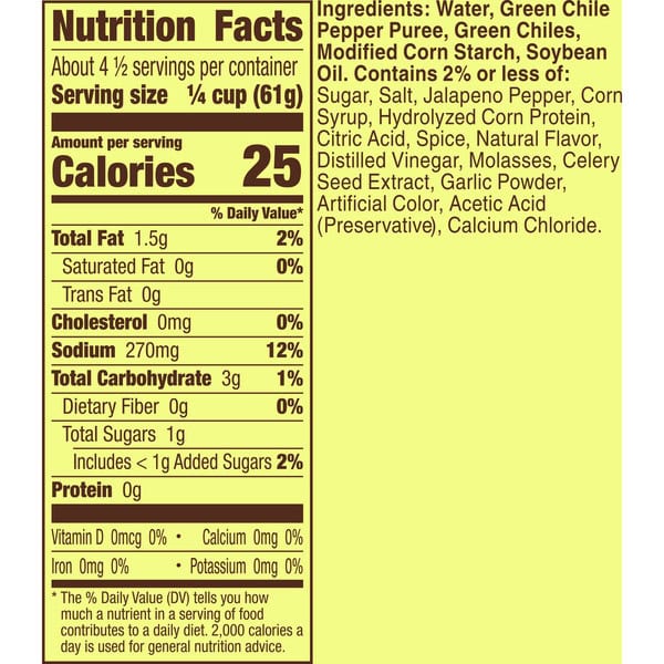 Water, Green Chile Pepper Puree, Green Chiles, Modified Corn Starch, Soybean Oil, Contains 2% Or Less Of: Sugar, Salt, Jalapeno Pepper, Corn Syrup, Hydrolyzed Corn Protein, Citric Acid, Spice, Natural Flavor, Distilled Vinegar, Molasses, Celery Seed Extract, Garlic Powder, Artificial Color, Acetic Acid (preservative), Calcium Chloride