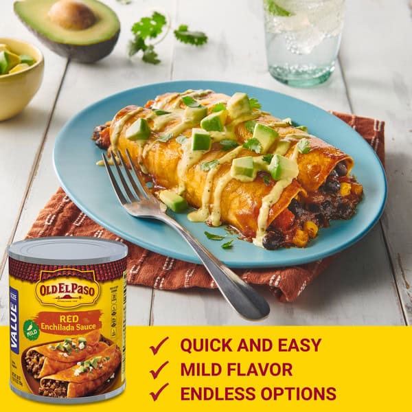 Put enchiladas on the menu tonight with the help of Old El Paso Mild Red Enchilada Sauce. The delicious blend of Mexican-inspired spices makes it a perfect red sauce for all your casseroles, salads, soups and other Mexican food creations. One can of this fan-favorite helps make tasty enchiladas for an easy weeknight meal option that the whole family will devour.
