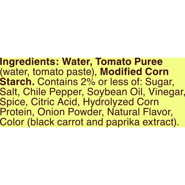 Water, Tomato Puree (water, Tomato Paste), Modified Corn Starch, Contains 2% Or Less Of: Sugar, Salt, Chile Pepper, Soybean Oil, Vinegar, Spice, Citric Acid, Hydrolyzed Corn Protein, Onion Powder, Natural Flavor, Color (black Carrot And Paprika Extract)