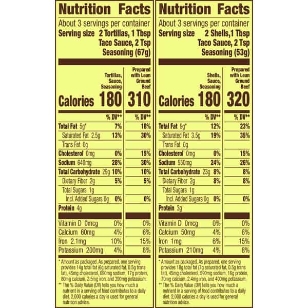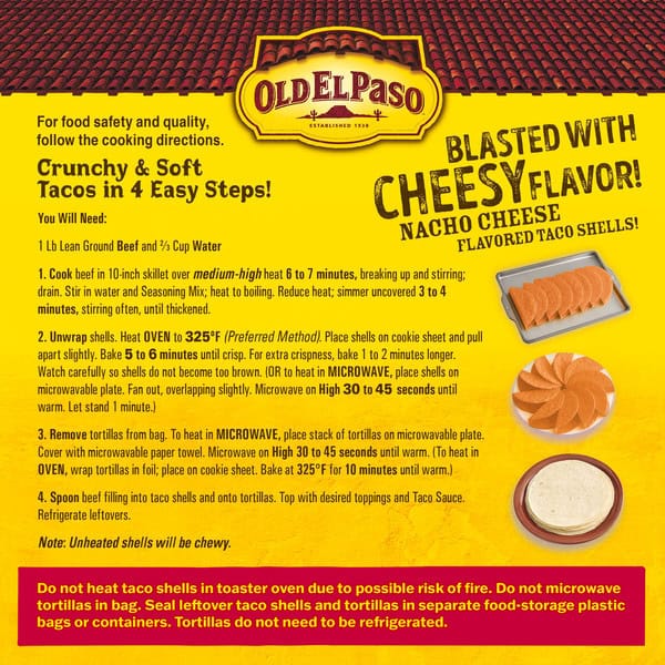 Crunchy & soft tacos in 4 easy steps! You Will Need: 1 lb lean ground beef and 2/3 cup water. (1) Cook beef in 10-inch skillet over medium-high heat 6 to 7 minutes, breaking up and stirring; drain. Stir in water and seasoning mix; heat to boiling. Reduce heat; simmer uncovered 3 to 4 minutes, stirring often, until thickened. (2) Unwrap shells. Heat oven to 325 degrees F (Preferred method). Place shells on cookie sheet and pull apart slightly. Bake 5 to 6 minutes until crisp. For extra crispness, bake 1 to 2 minutes longer. Watch carefully so shells do not become too brown. (OR to heat in microwave, place shells on microwavable plate. Fan out, overlapping slightly. Microwave on high 30 to 45 seconds. Until warm. Let stand 1 minute). (3) Remove tortillas from bag. To heat in microwave, place stack of tortillas on microwavable plate. Cover with microwavable paper towel. Microwave on high 30 to 45 seconds until warm. (To heat in oven, wrap tortillas in foil; place on cookie sheet. Bake at 325 degrees F or 10 minutes until warm). (4) Spoon beef filling into taco shells and onto tortillas. Top with desired toppings and taco sauce. Refrigerate leftovers. For food safety and quality, follow the cooking directions. Note: Unheated shells will be chewy. Do not heat taco shells in toaster oven due to possible risk of fire. Do not microwave tortillas in bag. Seal leftover taco shells and tortillas in separate food-storage plastic bags or containers. Tortillas do not need to be refrigerated.