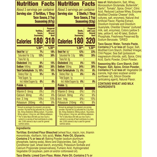 Tortillas – Tortillas: Enriched Bleached Flour (wheat Flour, Niacin, Iron, Thiamin Mononitrate, Riboflavin, Folic Acid), Water, Palm Oil, Glycerin. Contains 2% Or Less Of: Baking Powder (sodium Aluminum Phosphate, Baking Soda), Mono And Diglycerides, Salt, Potassium Sorbate And Calcium Propionate (preservatives), Fumaric Acid, Hydrogenated Vegetable Oil (soybean, Palm, And/or Cottonseed Oil), Dough Conditioner (salt, Wheat Starch, Enzymes), Taco Sauce: Water, Tomato Paste. Contains 2% Or Less Of: Sugar, Salt, Modified Corn Starch, Distilled Vinegar, Spice, Sea Salt (potassium Magnesium Chloride, Salt), Citric Acid, Garlic Powder, Onion Powder, Chili Pepper, Seasoning Mix: Chili Pepper, Salt, Onion Powder, Corn Starch, Spice, Sea Salt (potassium Magnesium Chloride, Salt), Maltodextrin. Contain 2% Or Less Of: Vegetable Oil (canola And/or Soybean Oil), Citric Acid, Sugar, Natural Flavor, Silicon Dioxide (anticaking Agent),taco Shells – Taco Shells: Lime Corn Flour, Water, Palm Oil. Contains 2 % Or Less Of: Maltodextrin, Salt, Whey, Monosodium Glutamate, Buttermilk*, Garlic*, Tomato*, Spice, Onion*, Citric Acid, Reduced Lactose Whey, Enzyme Modified Cheddar Cheese* (milk, Cultures, Salt, Enzymes), Natural And Artificial Flavor, Paprika Extract, Disodium Inosinate And Disodium Guanylate, Cheddar Cheese* (cultured Milk, Salt, Enzymes), Colors (yellow 5 Lake, Yellow 6, Red 40 Lake), Sodium Phosphate, Freshness Preserved By Sodium Benzoate, Taco Sauce: Water, Tomato Paste. Contains 2% Or Less Of: Sugar, Salt, Modified Corn Starch, Distilled Vinegar, Spice, Sea Salt (potassium Magnesium Chloride, Salt), Citric Acid, Garlic Powder, Onion Powder, Chili Pepper, Seasoning Mix: Chili Pepper, Salt, Onion Powder, Corn Starch, Spice, Sea Salt (potassium Magnesium Chloride, Salt), Maltodextrin. Contain 2% Or Less Of: Vegetable Oil (canola And/or Soybean Oil), Citric Acid, Sugar, Natural Flavor, Silicon Dioxide (anticaking Agent), *dried