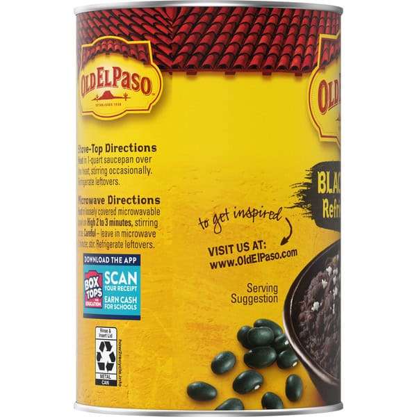 Old El Paso Black Bean Refried Beans create a delicious base for any Mexican-style food or tasty side dish. Made with just the right amount of spices, these canned beans are ready to add to tacos, burritos, nachos or any Mexican dish. Simply heat them up in the microwave or on the stovetop and enjoy. Tonight, we taco!