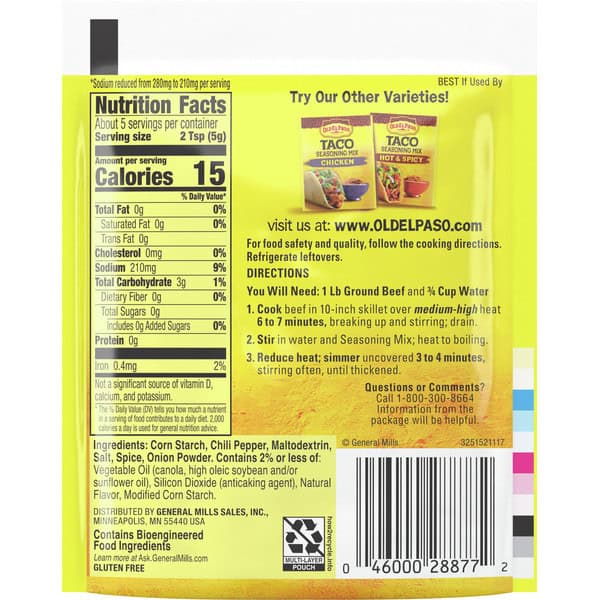 With 25% less sodium than original Old El Paso Original Taco Seasoning Mix, you can enjoy the perfect blend of spices and seasonings in your favorite taco recipe. This great-tasting taco seasoning blend can get your tacos on the table. Simply mix with your favorite filling or use it to add bold Mexican-inspired flavor to meats, soups, dips and more.