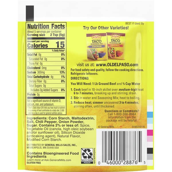 When you stock your pantry with Old El Paso Mild Taco Seasoning Mix, you’re ready to celebrate taco night, every night. These great-tasting spices and seasonings help you get tacos on the table. Simply mix with your favorite taco filling and cook. Plus, you can use this seasoning to add flavor to meats, soups, dips and more.