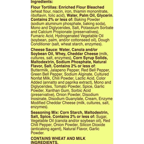 Flour Tortillas: Enriched Flour Bleached (wheat Flour, Niacin, Iron, Thiamin Mononitrate, Riboflavin, Folic Acid), Water, Palm Oil, Glycerin. Contains 2% Or Less Of: Baking Powder (sodium Aluminum Phosphate, Baking Soda), Mono And Diglycerides, Salt, Potassium Sorbate And Calcium Propionate (preservatives), Fumaric Acid, Hydrogenated Vegetable Oil (soybean, Palm, And/or Cottonseed Oil), Dough Conditioner (salt, Wheat Starch, Enzymes). Cheese Sauce: Water, Canola And/or Soybean Oil, Whey, Cheddar Cheese (milk, Cultures, Salt, Enzymes), Corn Syrup Solids, Maltodextrin, Sodium Phosphate, Natural Flavor, Salt. Contains 2% Or Less Of: Buttermilk, Jalapeno Pepper, Red Bell Pepper, Green Bell Pepper, Sodium Alginate, Cultured Nonfat Milk, Chili Powder, Lactic Acid, Color Added (annatto And Paprika Extract), Mono And Diglycerides, Tomato Powder, Spice, Garlic Powder, Xanthan Gum, Sorbic Acid (preservative), Onion Powder, Disodium Inosinate, Disodium Guanylate, Cream, Enzyme Modified Cheddar Cheese (milk, Cultures, Salt, Enzymes). Seasoning Mix: Corn Starch, Maltodextrin, Salt, Spice. Contains 2% Or Less Of: Sugar, Vegetable Oil (canola And/or Soybean Oil), Red Chili Pepper, Onion Powder, Silicon Dioxide (anticaking Agent), Natural Flavor, Garlic Powder.