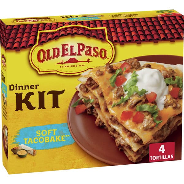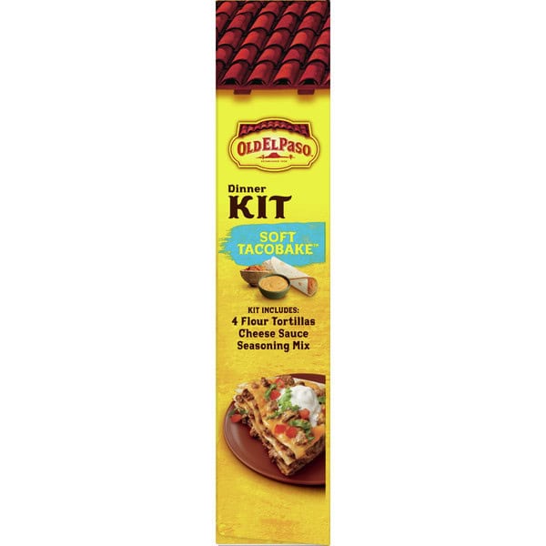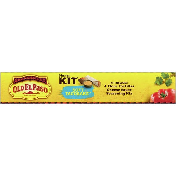 Make a delicious casserole-style soft tacobake with ease. The Old El Paso Soft TacoBake Dinner Kit comes with four flour tortillas, cheese sauce and taco seasoning. Follow the instructions to cook up your meat and add your favorite taco toppings for a cheesy tacobake that makes about four servings. When you want something soft and savory, grab a tacobake taco kit for an easy mealtime solution.