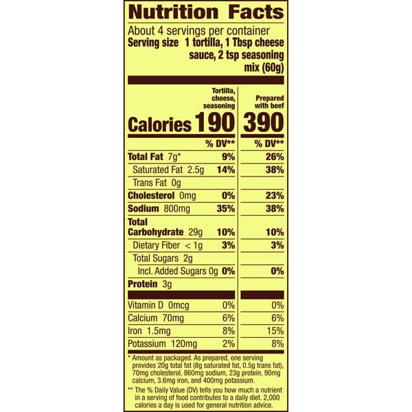 • Contains flour tortillas, cheese sauce and taco seasoning
