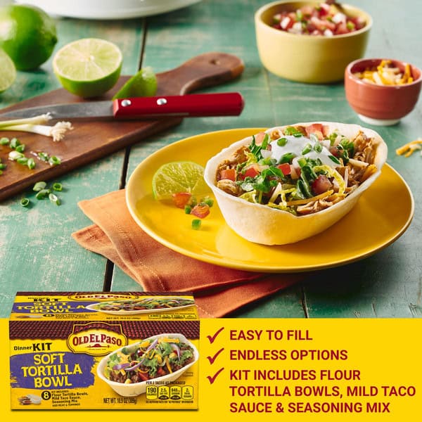 Old El Paso Soft Tortilla Bowl Dinner Kit makes it fun to spoon in your favorite taco fillings. Easy to fill, hold, and eat, you can have a quick and easy dinner option on the table in no time. Just fill the soft flour tortilla bowls with your favorite ingredients and enjoy a taco bowl that you can eat. This dinner kit comes with 8 flour tortilla bowls, mild taco sauce, and seasoning mix; you add the meat and toppings. Follow the simple instructions and you’ll have a weeknight meal the whole family will love. For more than 80 years, Old El Paso has been bringing families and communities together to celebrate old and new traditions around delicious, Mexican inspired flavors. We believe that any night can be a taco night, and we’re here to help make it a little easier and a lot more delicious. Our variety of crispy hard taco shells, tasty soft tortillas, flavorful seasonings, and much more help make taco night fun. Contains Shelf-Stable Old El Paso Soft Tortilla Bowl Taco Dinner Kit, Mild Taco Sauce and Seasoning Mix, 10.9 oz.
