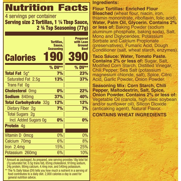 Flour Tortillas: Enriched Bleached Flour (wheat Flour, Niacin, Iron, Thiamin Mononitrate, Riboflavin, Folic Acid), Water, Palm Oil, Glycerin. Contains 2% Or Less Of: Baking Powder (sodium Aluminum Phosphate, Baking Soda), Salt, Mono And Diglycerides, Potassium Sorbate And Calcium Propionate (preservatives), Fumaric Acid, Dough Conditioner (salt, Wheat Starch, Enzymes), Taco Sauce: Water, Tomato Paste. Contains 2% Or Less Of: Sugar, Salt, Modified Corn Starch, Distilled Vinegar, Spice, Sea Salt (potassium Magnesium Chloride, Salt), Citric Acid, Garlic Powder, Onion Powder, Chili Pepper, Seasoning Mix: Chili Pepper, Corn Starch, Salt, Onion Powder, Maltodextrin, Spice, Sea Salt (potassium Magnesium Chloride, Salt). Contains 2% Or Less Of: Vegetable Oil (canola Oil And/or Soybean Oil), Silicon Dioxide (anticaking Agent), Citric Acid, Sugar, Natural Flavor
