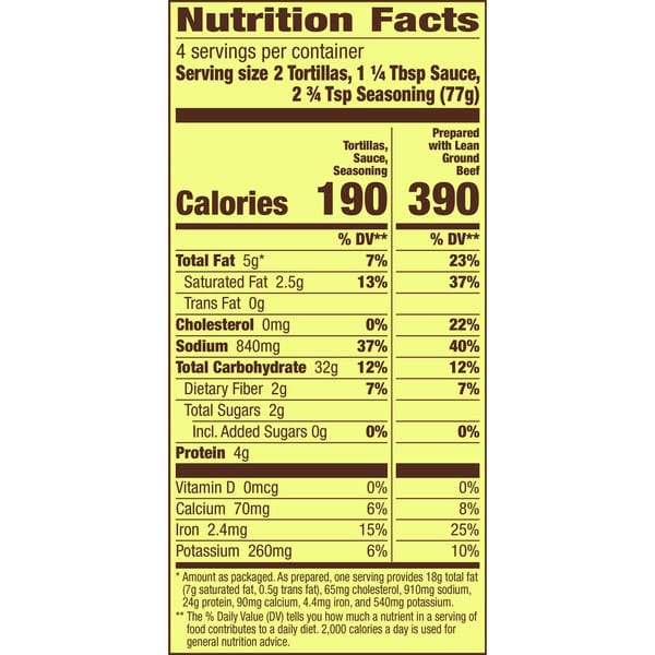 Make 8 Ground Beef Tacos in 3 Easy Steps! You Will Need: 1 lb ground beef and 3/4 cup water. 1. Cook beef in 10-inch skillet over medium-high heat 6 to 7 minutes, breaking up and stirring; drain. Stir in water and seasoning mix; heat to boiling. Reduce heat; simmer uncovered 3 to 4 minutes, stirring often, until thickened. 2. Pull tab to open package of tortillas. Remove tortillas. To heat in microwave, wrap stack of tortillas in microwavable paper towel; place on microwavable plate. Microwave on high 20 to 25 seconds until warm. (To heat in oven, wrap stack of tortillas in foil; place on cookie sheet. Bake at 325 degrees F for 7 to 10 minutes until warm.) 3. Spoon beef filling into tortillas. Top with desired toppings and Taco Sauce. Do not heat tortillas in package. Store leftover tortillas in resealable food bag or container. Tortillas do not need to be refrigerated. For food safety and quality, follow the cooking direction. Refrigerate leftovers.