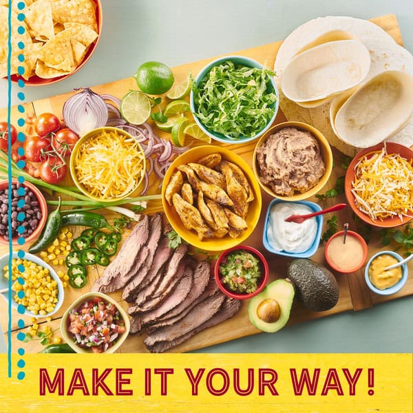 • TOP THAT TORTILLA: Add your favorite meat and toppings to soft tortilla bowls; This kit includes eight tortilla bowls, mild taco sauce, and seasoning mix