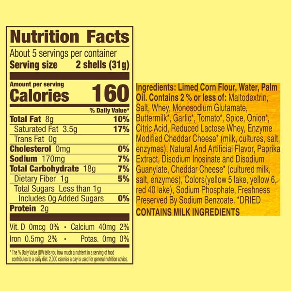 Limed Corn Flour, Water, Palm Oil, Contains 2% Or Less Of: Maltodextrin, Salt, Whey, Monosodium Glutamate, Buttermilk*, Garlic*, Tomato*, Spice, Onion*, Citric Acid, Reduced Lactose Whey, Enzyme Modified Cheddar Cheese* (milk, Cultures, Salt, Enzymes), Natural And Artificial Flavor, Paprika Extract, Disodium Inosinate And Disodium Guanylate, Cheddar Cheese* (cultured Milk, Salt, Enzymes), Colors (yellow 5 Lake, Yellow 6, Red 40 Lake), Sodium Phosphate, Freshness Preserved By Sodium Benzoate, *dried