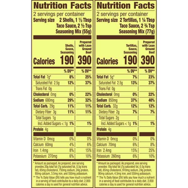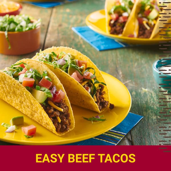 For food safety and quality, follow the cooking directions. Make 8 Tacos in 4 Easy Steps! You Will Need: 1 lb lean ground beef and 2/3 cup water 1. Cook beef in 10-inch skillet over medium-high heat 6 to 7 minutes, breaking up and stirring; drain. Stir in water and seasoning mix; heat to boiling. Reduce heat; simmer uncovered 3 to 4 minutes, stirring often, until thickened. 2. Unwrap taco shells. To heat in oven, place shells on cookie sheet and pull apart slightly. Bake at 325 degree F for 4 to 6 minutes until crisp. (To heat in microwave, place shells on microwavable plate. Fan out, overlapping slightly. Microwave on high 25 to 30 seconds until warm.) 3. Pull tab to open package of tortillas. To heat in microwave, wrap stack of tortillas in microwavable paper towel; place on microwavable plate. Microwave on high 10 to 15 seconds until warm. (To heat in oven, wrap stack of tortillas in foil; place on cookie sheet. Bake at 325 degree F for 5 to 7 minutes until warm.) 4. Spoon beef filling into taco shells and tortillas. Top with desired toppings and taco sauce. Refrigerate leftovers. Do not heat taco shells in toaster oven due to possible risk of fire. Do not microwave tortillas in package. Seal leftover taco shells and tortillas in separate food-storage plastic bags or containers.