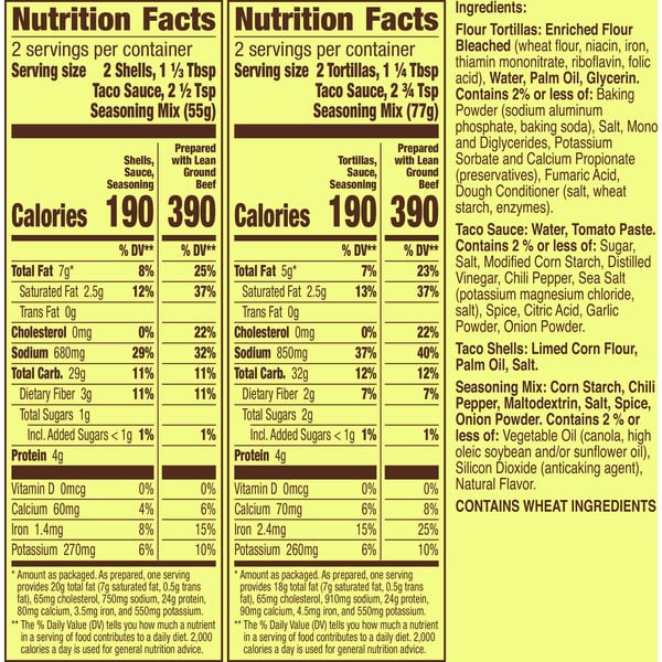 Stand ‘n Stuff Taco Shells – Taco Shells: Limed Corn Flour, Palm Oil, Salt, Taco Sauce: Water, Tomato Paste. Contains 2% Or Less Of: Sugar, Salt, Modified Corn Starch, Distilled Vinegar, Spice, Sea Salt (potassium Magnesium Chloride, Salt), Citric Acid, Garlic Powder, Onion Powder, Chili Pepper, Seasoning Mix: Chili Pepper, Corn Starch, Salt, Onion Powder, Maltodextrin, Spice, Sea Salt (potassium Magnesium Chloride, Salt). Contains 2% Or Less Of: Vegetable Oil (canola And/or Soybean Oil), Corn Flour, Silicon Dioxide (anticaking Agent), Citric Acid, Sugar, Natural Flavor,stand ‘n Stuff Flour Tortillas – Flour Tortillas: Enriched Flour Bleached (wheat Flour, Niacin, Iron, Thiamin Mononitrate, Riboflavin, Folic Acid), Water, Palm Oil, Glycerin. Contains 2% Or Less Of: Baking Powder (sodium Aluminum Phosphate, Baking Soda), Salt, Mono And Diglycerides, Potassium Sorbate And Calcium Propionate (preservatives), Fumaric Acid, Dough Conditioner (salt, Wheat Starch, Enzymes), Taco Sauce: Water, Tomato Paste. Contains 2% Or Less Of: Sugar, Salt, Modified Corn Starch, Distilled Vinegar, Spice, Sea Salt (potassium Magnesium Chloride, Salt), Citric Acid, Garlic Powder, Onion Powder, Chili Pepper, Seasoning Mix: Chili Pepper, Corn Starch, Salt, Onion Powder, Maltodextrin, Spice, Sea Salt (potassium Magnesium Chloride, Salt). Contains 2% Or Less Of: Vegetable Oil (canola And/or Soybean Oil), Corn Flour, Silicon Dioxide (anticaking Agent), Citric Acid, Sugar, Natural Flavor
