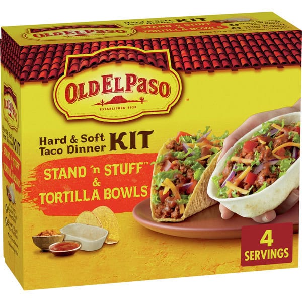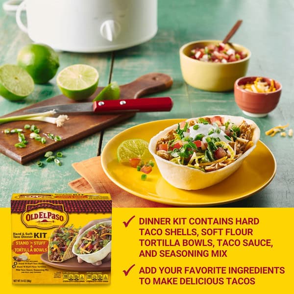 Tacos your way! Start your taco night off right with Old El Paso’s Hard & Soft Taco Dinner Kit, featuring Stand ‘N Stuff hard taco shells and flour tortilla bowls. Both options are easy to stuff with your favorite toppings for an effortless dinner option. This taco dinner kit comes with four Stand ‘N Stuff corn tortilla shells, four flour tortilla bowls, mild taco sauce and a seasoning mix.