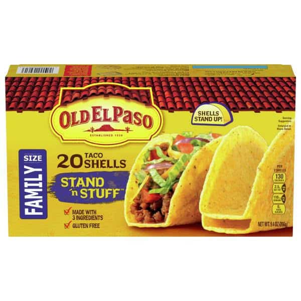 Make taco night a stand’n invitation with Old El Paso Stand ‘N Stuff Crunchy Taco Shells. Stand ‘N Stuff Shells have a flat bottom so they stand up on their own. Fill these gluten-free taco shells up with your favorite meats, cheeses, beans and fresh toppings for a taco fiesta. Now in a larger size to feed the entire family!