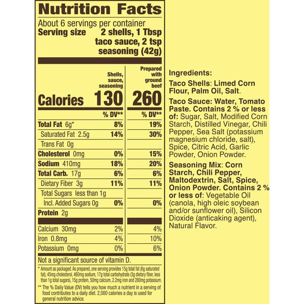 • TACO SHELLS: Dinner kit contains crunchy taco shells, taco sauce and seasoning mix