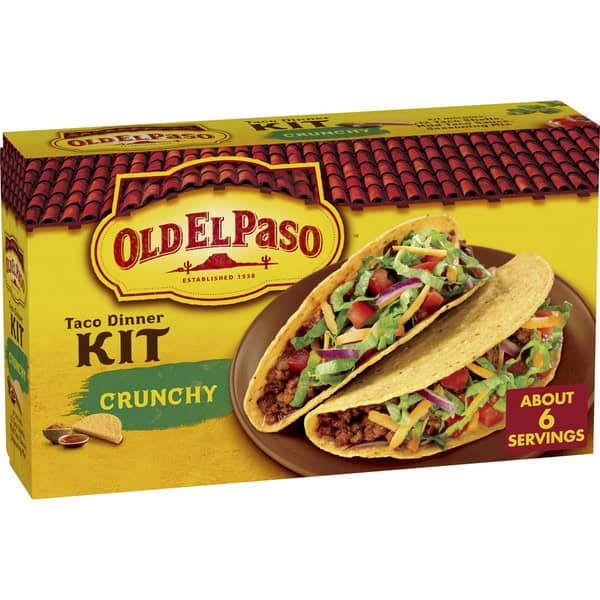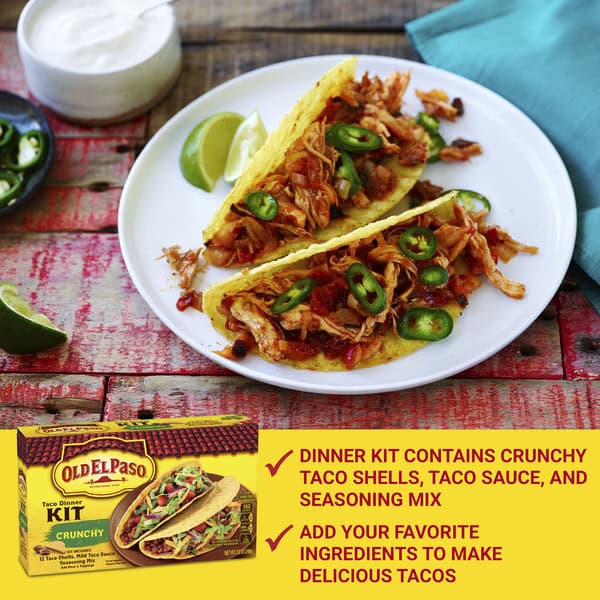Take the trouble out of taco night with Old El Paso Crunchy Taco Shells Dinner Kits. You get 12 Old El Paso crunchy taco shells, taco seasoning and taco sauce all in one box, so your tacos can be ready in about 20 minutes. Simply add your favorite fillings and toppings to create an easy and delicious fiesta any night of the week. Tonight, we taco!