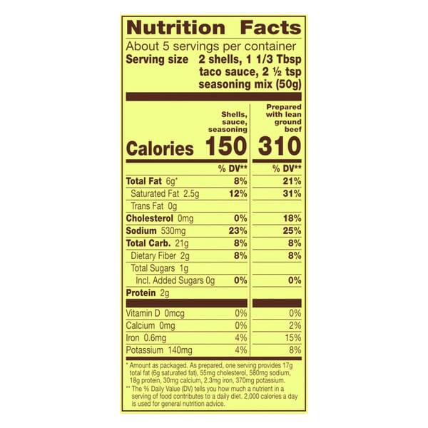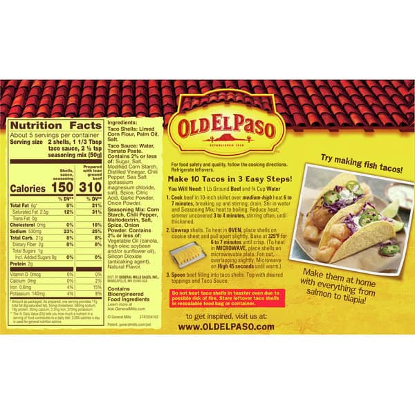 For Food Safety and Quality, Follow the Cooking Directions: Make 10 tacos in 3 easy steps! You will need: 1 lb lean ground beef and 2/3 cup water. 1. Cook beef in 10-inch skillet over medium-high heat 6 to 7 minutes, breaking up and stirring; drain. Stir in water and seasoning mix; heat to boiling. Reduce heat; simmer uncovered 3 to 4 minutes, stirring often, until thickened. 2. Unwrap shells. To heat in oven, place shells on cookie sheet and pull apart slightly. Bake at 325 degree F for 6 to 7 minutes until crisp. (To heat in microwave, place shells on microwavable plate. Fan out, overlapping slightly. Microwave on high 45 seconds until warm.). 3. Spoon beef filling into taco shells. Top with desired toppings and taco sauce.