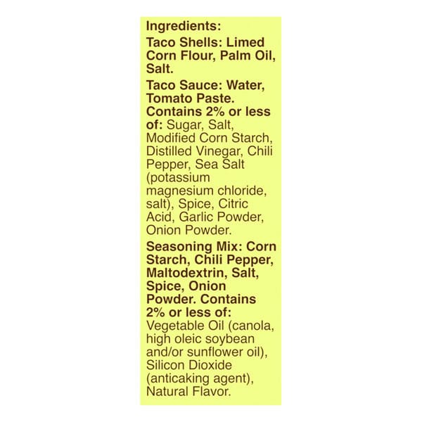 Taco Shells: Limed Corn Flour, Palm Oil, Salt, Taco Sauce: Water, Tomato Paste. Contains 2% Or Less Of: Sugar, Salt, Modified Corn Starch, Distilled Vinegar, Spice, Sea Salt (potassium Magnesium Chloride, Salt), Citric Acid, Garlic Powder, Onion Powder, Chili Pepper, Seasoning Mix: Chili Pepper, Corn Starch, Salt, Onion Powder, Maltodextrin, Spice, Sea Salt (potassium Magnesium Chloride, Salt). Contains 2 % Or Less Of: Vegetable Oil (canola Oil And/or Soybean Oil), Silicon Dioxide (anticaking Agent), Citric Acid, Sugar, Natural Flavor