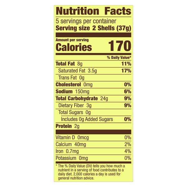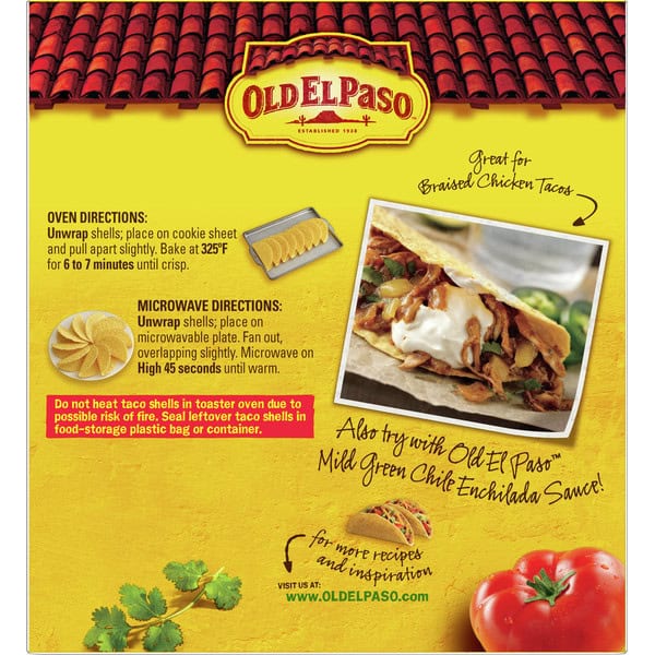 Oven Directions: Unwrap shells; place on cookie sheet and pull apart slightly. Bake at 325 degrees F for 6 to 7 minutes until crisp. Microwave Directions: Unwrap shells; place on microwavable plate. Fan out, overlapping slightly. Microwave on high 45 seconds until warm. Do not heat taco shells in toaster oven due to possible risk of fire. Seal leftover taco shells in food-storage plastic bag or container.