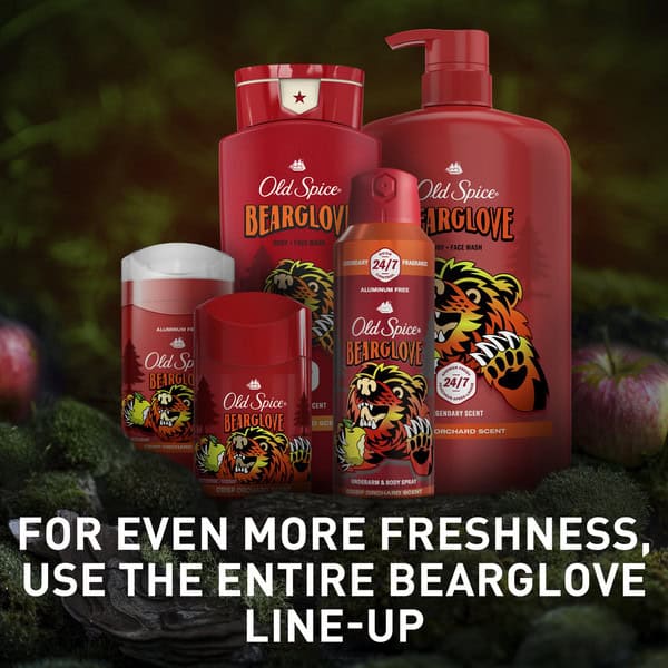 Deep in every man, beneath the people clothes and remembering how to drive, beats the heart of a wild animal. Bearglove Old Spice Deodorant for men is an aluminum-free deodorant with triple protection power-unleashing 24/7* odor protection and a ridiculously long-lasting scent. This powerful deodorant goes on clear and clean, leaving you feeling fresh. The scent features a lively, fresh take on apple with masculine notes of zesty citrus, crisp greens, and a touch of spice for added fullness. Dare we say, this is one sniffworthy scent. Confidently climb the ladder of success without fear of slipping with Old Spice Bearglove aluminum free deodorant for men. Check out the entire Old Spice Wild Collection for legendary fragrances and smell sniffworthy.*with daily use