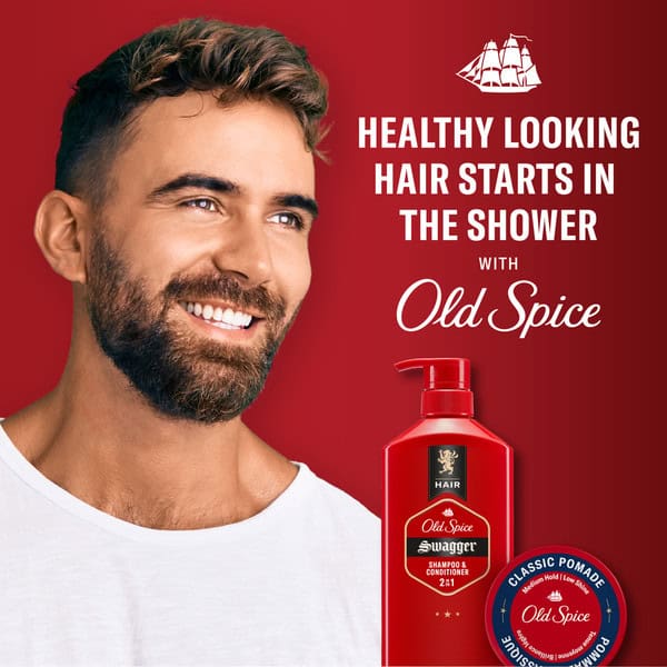 Trade in your shampoo and conditioner routine and trade up to the power of Old Spice Swagger 2in1 shampoo and conditioner. Designed by the leading experts in male hair care, this hardworking shampoo and conditioner formula was specifically designed for men and removes built-up dirt and oil to help guys achieve noticeably lifted hair. Shower with Old Spice Swagger Shampoo + Conditioner designed with scents notes of refreshing lime and cedarwood. With a smell this great, don’t be surprised if showering becomes the highlight of your day (until you step out and see how great your hair looks, of course). Did you know that by age 35, two out of every three guys will experience some degree of noticeable hair loss? Yep, it’s true! Fortunately, Old Spice Swagger 2in1 men’s shampoo + conditioner helps guys achieve thick and healthy-looking hair…and it smells amazing! With Old Spice Swagger 2 in 1 shampoo and conditioner, you can achieve fuller looking, head-turning hair starting with just one wash. You’ll make your barber proud when you lather up your manliest locks with Old Spice Swagger 2in1 shampoo + conditioner. That’s because this men’s shampoo and conditioner were inspired by barbers and crafted for barbershop quality results. Now go dry off and enjoy that just-left-the-barbershop feeling. Try Old Spice Swagger 2 in 1 shampoo for men today and experience the difference…your hair will thank you for it! *vs. unwashed hair