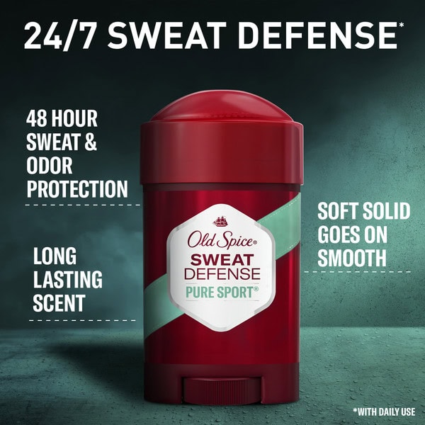 Proven defense against sweat and odor has arrived. Old Spice Sweat Defense brings the trifecta of triple protection power right to your body with this greatness-amplifying soft solid antiperspirant and deodorant. Old Spice Sweat Defense glides on smooth to provide the ultimate in defense against sweat and odor. Get 48 hardworking hours of proven sweat and odor protection. Old Spice Sweat Defense Soft Solid Antiperspirant and Deodorant, Pure Sport Plus, 2.6 oz keeps you feeling dry all day and promotes stronger and longer lasting sweat protection vs. invisible solid anti-perspirant and deodorant. Don’t sweat over your grooming products, grab Old Spice today, because anything less than Old Spice isn’t Old Spice.