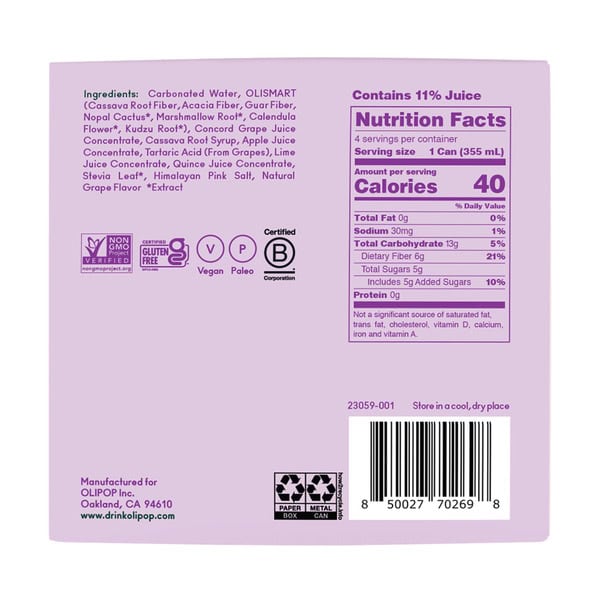 Carbonated Water, OLISMART (Cassava Root Fiber, Chicory Root Inulin, Jerusalem Artichoke Inulin, Nopal Cactus*, Marshmallow Root*, Calendula Flower*, Kudzu Root*), Concord Grape Juice Concentrate, Lime Juice, Apple Juice Concentrate, Cassava Root Syrup, Tartaric Acid (From Grapes), Stevia Leaf*, Himalayan Pink Salt, Natural Grape Flavor