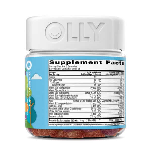 OLLY kids vitamins are super delicious, supported by science, and gluten free. Kiddos 2-3 years, chew one vitamin daily and 4 years and up, chew two daily.