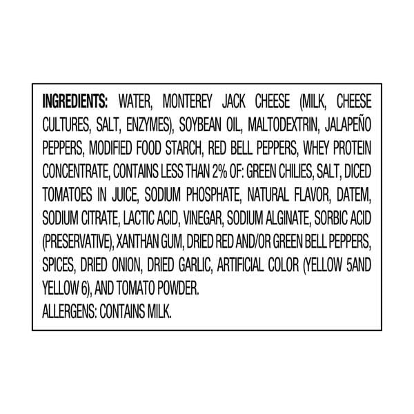 Water, Monterey Jack Cheese (milk, Cheese Cultures, Salt, Enzymes), Nonfat Milk, Soybean Oil, Jalapeno Peppers, Modified Corn Starch, Maltodextrin, Red Bell Peppers, Whey Protein Concentrate, And Contains Less Than 2% Of The Following: Green Chiles, Diced Tomatoes In Juice, Spices, Salt, Sodium Phosphate, Natural Flavor, Lactic Acid, Datem, Sodium Alginate, Xanthan Gum, Vinegar, Sodium Citrate, Sorbic Acid (preservative), And Artificial Color (fd&c Yellow #5 And Fd&c Yellow #6).