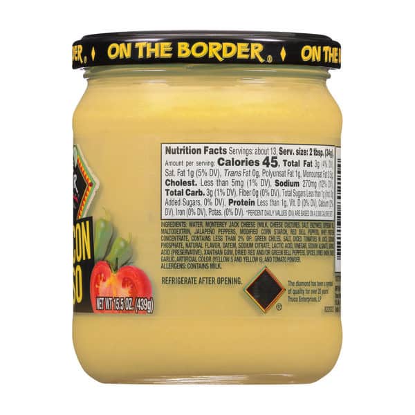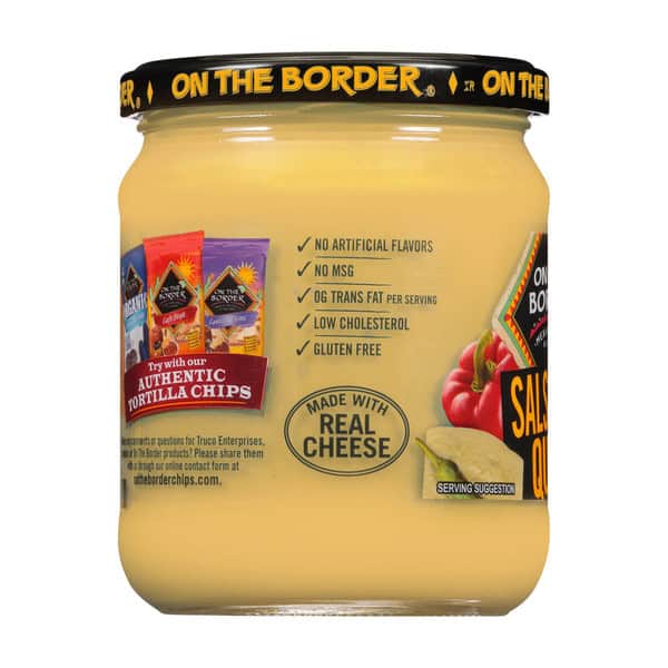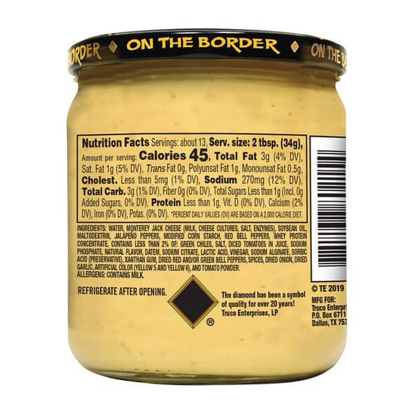 Mexican grill & cantina. Celebrate with quality. The diamond has been a symbol of quality for over 20 years. Try with our authentic tortilla chips. Have any comments or questions for Truco Enterprises, makers of On The Border products? Please share them with us through our online contact form at ontheborderproducts.com. No artificial flavors. No msg. 0 g trans fat per serving. Low cholesterol. Gluten free. Made with real cheese.