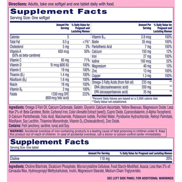 Ingredients: Choline Bitartrate, Dicalcium Phosphate, Microcrystalline Cellulose, Food Starch-modified, Acacia; Less Than 2% Of: Carnauba Wax, Hydroxypropyl Methylcellulose, Inulin, Magnesium Stearate, Medium Chain Triglycerides.,ingredients: Omega-3 Fish Oil, Calcium Carbonate, Gelatin, Glycerin, Calcium Ascorbate, Yellow Beeswax, Magnesium Oxide; Less Than 2% Of: Beta-carotene, Biotin, Carbonyl Iron, Color (annatto Extract [seed]), Cupric Oxide, Cyanocobalamin, D-alpha-tocopherol, D-calcium Pantothenate, Folic Acid, Niacinamide, Potassium Lodide, Purified Water, Pyridoxine Hydrochloride, Retinyl Palmitate, Riboflavin, Soy Lecithin, Thiamine Mononitrate, Vitamin D3 (cholecalciferol), Zinc Oxide.