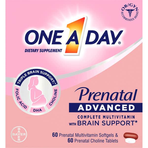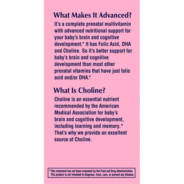 Dietary Supplement. OB/GYN recommended brand. Triple Brain Support: Folic Acid; DHA; Choline. With brain support. What makes it advanced? It’s a complete prenatal multivitamin with advanced nutritional support for you baby’s and cognitive development. It has folic acid, DHA and Choline. So it’s better support for baby’s brain and cognitive development than most other prenatal vitamins that have just folic acid and/or DHA. What is Choline? Choline is an essential nutrient recommended by the American Medical Association for baby’s brain and cognitive development, including learning and memory. That’s why we provide an excellent source of choline. Questions or comments? Please text or call 1-800-800-4793 (Mon-Fri 9AM – 5PM EST). (This statement has not been evaluated by the Food and Drug Administration. This product is not intended ti diagnose, treat, cure or prevent disease.) Multivitamins Softgel: Product of Spain. Choline Tablet: Product of Italy.