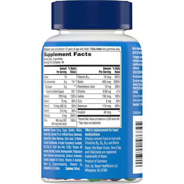 Glucose Syrup, Sugar, Gelatin, Water, Ascorbic Acid, Less Than 2% Of: Artificial Flavor, Beeswax, Camauba Wax, Choline Bitartrate, Citric Acid, D-biotin, D-calcium Pantothenate, Dl-alpha-tocopheryl Acetate, Fd&c Blue #1, Fd&c Red #40, Fd&c Yellow #5 Tartrazine), Folic Acid, Inositol, Neohesperidin, Potassium Iodide, Pyridoxine Hydrochloride, Sodium Selenate, Sucralose, Vegetable Oil (palm), Vitamin A Acetate, Vitamin B₁₂ (cyanocobalamin), Vitamin D₃ Cholecalciferol), Zinc Sulfate