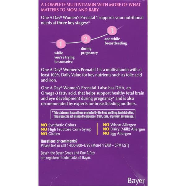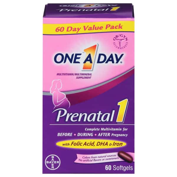 60 Day value pack. OB/Gyn recommended. Complete multivitamins for before, during, after pregnancy with folic acid, DHA & iron. Color from natural sources. Due to the use of colors derived from natural sources, some dark spots may appear on the softgel over time. This does not impact product quality or safety. A complete multivitamin with more of what matters to mom and baby. One A Day Women’s Prenatal 1 supports your nutritional needs at three key stages: 1. While you’re trying to conceive. 2. During pregnancy. 3. And while breastfeeding. One A Day Women’s Prenatal 1 is a multivitamin with at least 100% Daily Value for key nutrients such as folic acid and iron. One A Day Women’s Prenatal 1 also has DHA, an Omega-3 fatty acid, that helps support healthy fetal brain and eye development during pregnancy and is also recommended by experts for breastfeeding mothers. No synthetic colors. No high fructose corn syrup.