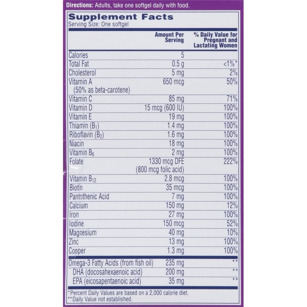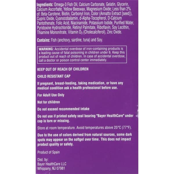 Calcium Carbonate, Omega-3 Fish Oil, Gelatin, Glycerin, Magnesium Oxide, Yellow Beeswax, Ascorbic Acid; Less Than 2% Of: Beta-carotene, Biotin, Carbonyl Iron, Cupric Oxide, D-alpha Tocopherol, D-calcium Pantothenate, Fd&c Blue #1, Fd&c Red #40, Folic Acid, Niacinamide, Potassium Iodide, Purified Water, Pyridoxine Hydrochloride, Riboflavin, Soy Lecithin, Thiamine Mononitrate, Titanium Dioxide (color), Vitamin A Palmitate, Vitamin B12, Vitamin D3 (cholecalciferol), Zinc Oxide.