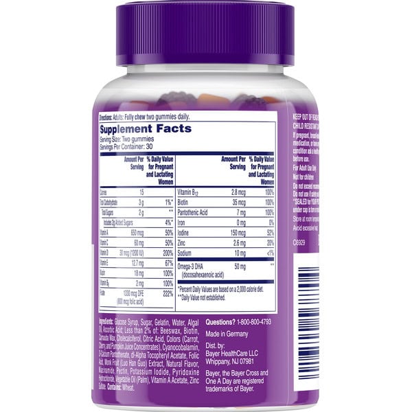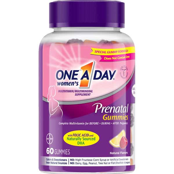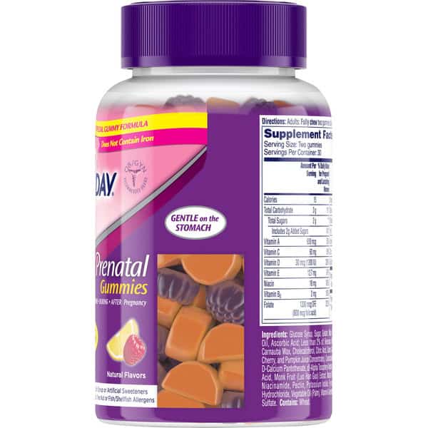 Sepcial gummy formula. Does not contain iron. OB/GYN recommended brand. Complete multivitamins for before, during, after pregnancy. With folic acid and naturally sourced DHA. Natural flavors. Colors & sweeteners from natural sources. No: High fructose corn syrup or artificial sweeteners.