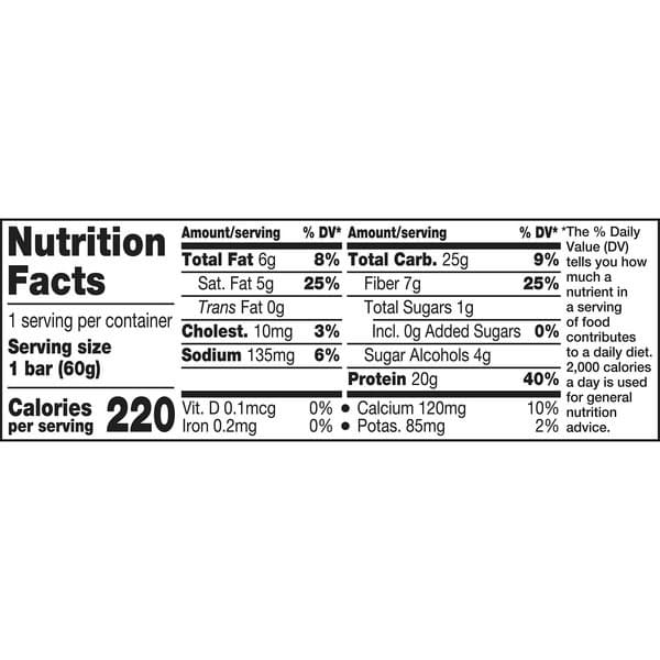 • A kosher and gluten free protein bar with 20 grams of protein and 1 gram of sugar
