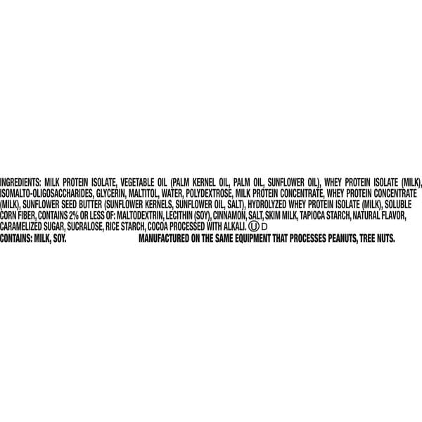 Ingredients: Protein Blend (milk Protein Isolate, Whey Protein Isolate), Vegetable Oil Blend (palm, Palm Kernel), Isomalto-oligosaccharides (vegetable Source), Vegetable Glycerin, Maltitol, Polydextrose, Soluble Vegetable Fiber, Sunflower Seed Butter, Whey Protein Concentrate, Natural Flavors, Soy Lecithin (an Emulsifier), Cinnamon, Maltodextrin, Sea Salt, Tapioca Starch, Nonfat Dry Milk, Distilled Monoglycerides, Sucralose, Calcium Carbonate, Cocoa Powder (processed With Alkali) And Paprika Extract (for Color).