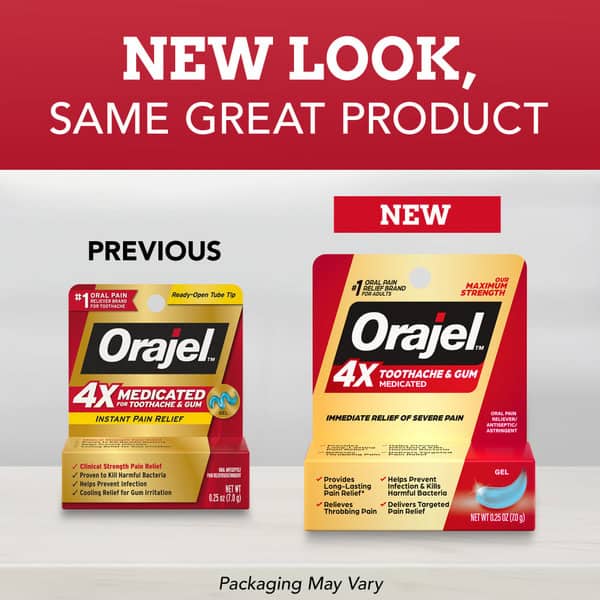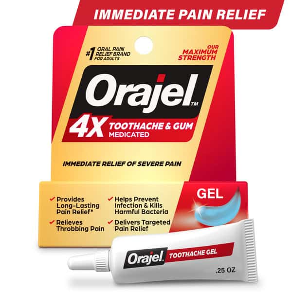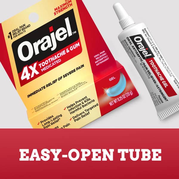 Orajelâ„¢ 4X Medicated Toothache & Gum Gel provides instant pain relief for severe toothaches and painful gums. The formula combines the power of four active ingredients for fast topical pain relief. The instant pain relief cream contains 20% benzocaine to offer clinical strength pain relief and is proven to kill harmful bacteria as it prevents infections and provides cooling relief for gum irritation. The cream is now easily accessible with the ready-open tube tip. This oral analgesic is inteded for adults adn children 2 years of age adn over and can be applied to the affected area up to 4 times daily. Orajel is the #1 oral pain reliever brand for Toothache.