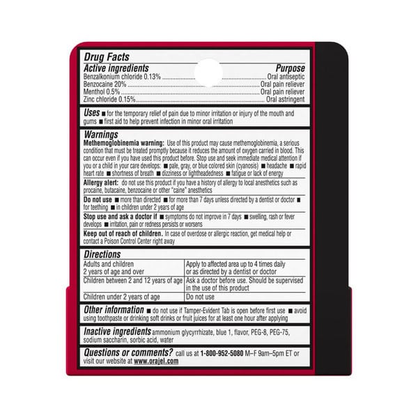 Methemoglobinemia warning: Use of this product may cause methemoglobinemia, a serious condition that must be treated promptly because it reduces the amount of oxygen carried in blood. This can occur even if you have used this product before. Stop use and seek immediate medical attention if you or a child in your care develops: pale, gray, or blue colored skin (cyanosis), headache, rapid heart rate, shortness of breath, dizziness or lightheadedness, fatigue or lack of energy. Allergy alert: do not use this product if you have a history of allergy to local anesthetics such as procaine, butacaine, benzocaine or other caine” anesthetics. Do not use: more than directed. For more than 7 days unless directed by a dentist or doctor. For teething. In children under 2 years of age. Stop use and ask a doctor if: symptoms do not improve in 7 days. Swelling, rash or fever develops. Irritation, pain or redness persists or worsens. Keep out of reach of children. In case of overdose or allergic reaction, get medical help or contact a Poison Control Center right away.”