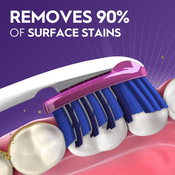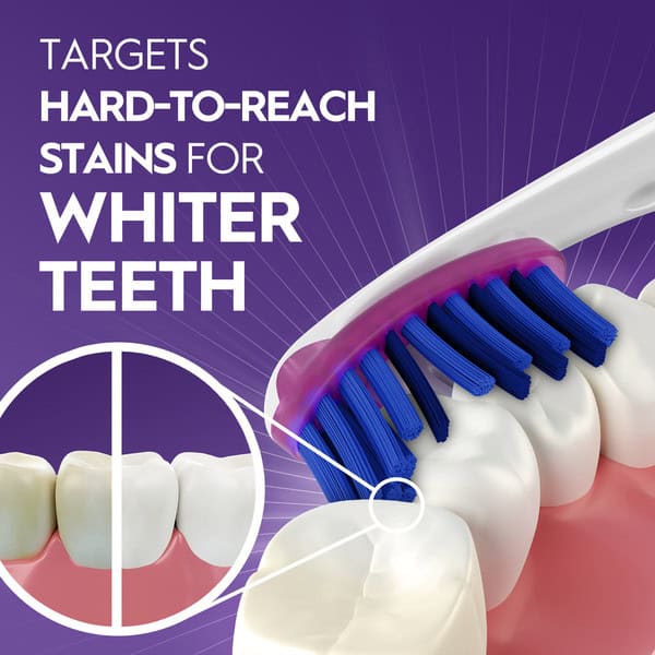 The Oral-B Pro Whitening toothbrush removes 90% of surface stains for a whiter smile. This is due to the toothbrush head and its dual-flexing design combined with a unique Stain Eraser. The dual flexing sides are able to adapt to each of your teeth. This toothbrush also features power tip bristles to reach difficult-to-access areas behind back teeth. The Oral-B Pro Whitening toothbrush whitens teeth by removing surface stains including stains in hard-to-reach areas – along your gumline and between your teeth. This medium bristle toothbrush has end-rounded bristles that are gentle on teeth and gums. For the best results, change your toothbrush regularly. A new toothbrush cleans 95% better in hard-to-reach areas*. This pack of Oral-B toothbrushes include different colors of toothbrushes for households with multiple people or stocking up. Oral-B is the #1 Toothbrush Brand Used by Dentists Worldwide. *vs. one 3 months old; research with a flat trim toothbrush